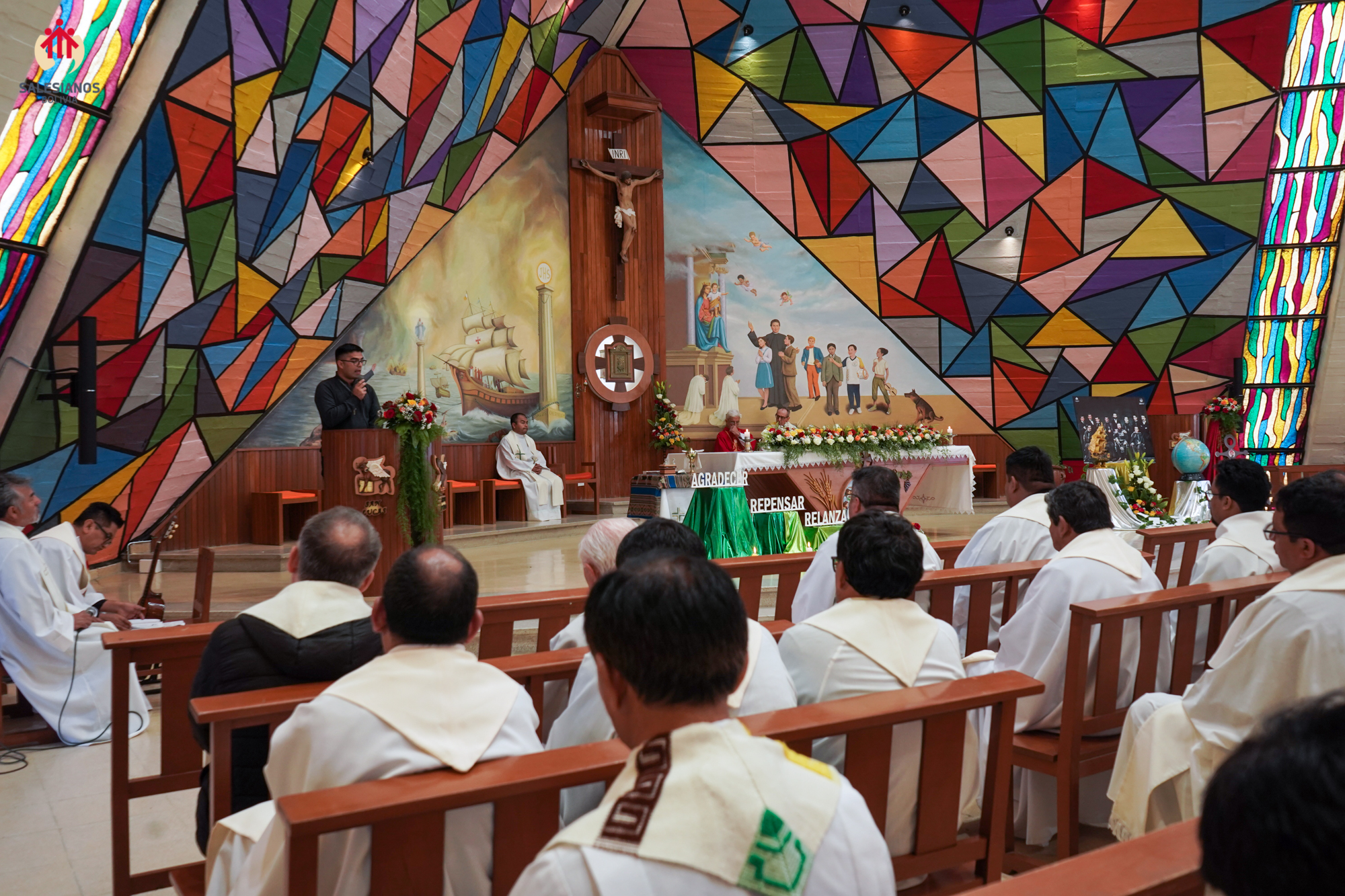 El encuentro fraterno se aperturó, el viernes 26, con la oración de laudes, adaptada a la celebración misionera en cuestión, en la que se subrayó, mediante un gesto de gratitud especial, el recuerdo de los hermanos salesianos misioneros que han construido, con la entrega de su vida, la presencia salesiana en Bolivia, desde hace casi 130 años. En esta línea, la mañana de esta jornada fue un canto de GRATITUD, de parte de cada una de las comunidades, por el don de la misión salesiana en Bolivia y, sobre todo, por las personas que la llevan a cabo en cada una de las CEP’s, con el espíritu del Sistema Preventivo. La gratitud Inspectorial encontró su culmen en la celebración eucarística en la que los congregados se unieron a la acción de gracias de P. Severino Laredo por el 50 aniversario de ordenación presbiteral y de vida misionera en Bolivia. La tarde de ese mismo día, el sentido de gratitud por los más de 12000 salesianos y miembros de la Familia Salesiana misioneros se trasformó en un REPENSAR la misión salesiana en Bolivia. Con la ayuda del P. Roberto Tomichá, franciscano capuchino, experto en misionología, los participantes de adentraron en una reflexión teológico misionológica que les posibilite un repensamiento de la misión salesiana, con y en favor de los jóvenes. La presentación del P. Tomichá condujo a la Asamblea a un momento de discernimiento grupal, mediante la metodología sinodal de “Conversación en el Espíritu”. Por la noche, después del rosario misionero, la jornada concluyó con las Buenas Noches salesianas por parte de algunos salesianos coadjutores y del P. Marcelo Escalante, quien presentó el documental que sintetiza la reciente publicación conmemorativa por los 25 años de la Basílica de María Auxiliadora de La Paz. El sábado 27, iluminados por la palabra del Consejero Mundial para las misiones, P. Jorge Crisafuli, los salesianos se adentraron en el tercer verbo del aniversario misionero: RELANZAR. Mediante la plataforma Zoom, el P. Crisafuli se unió a la Asamblea para recordar que el relanzamiento de la misión salesiana coincide con retorno a las fuentes de la Espiritualidad, un retorno a Jesús de Nazaret, tal como lo contemplaba Don Bosco; y un retorno a la misión comunitaria en salida, con la atención y sensibilidad de los orígenes, atentos a las nuevas pobrezas juveniles. La motivadora intervención del Consejero para las Misiones fue ocasión de relanzamiento de la misión salesiana en las nuevas comunidades para el 2026. En efecto, el P. Inspector, Líder Justiniano, entregó oficialmente las nuevas obediencias para el año venidero e instó a las comunidades que se iban a constituir a dejarse iluminar por las palabras del P. Jorge.
